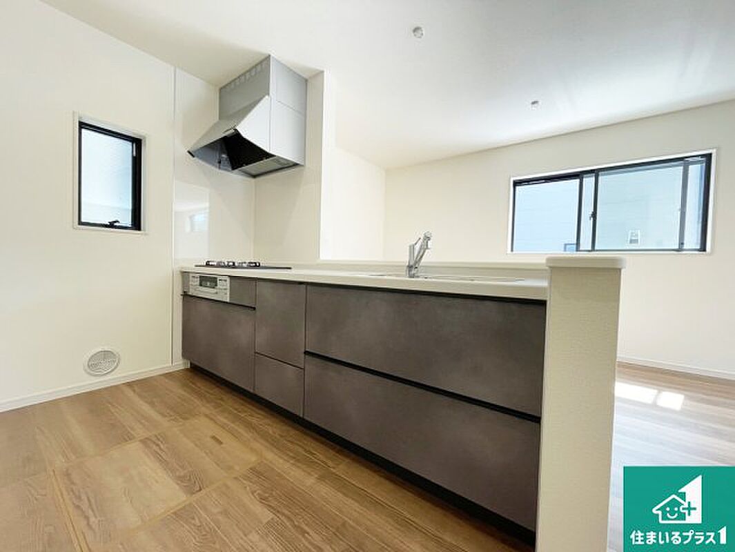 「大和郡山市東岡町 第2期 新築一戸建て」。新築戸建てはみんなの夢です。駅から徒歩8分圏内に立地しています。デザイン性のあるシステムキッチン付きなので、キッチンがお洒落なスペースになっています。