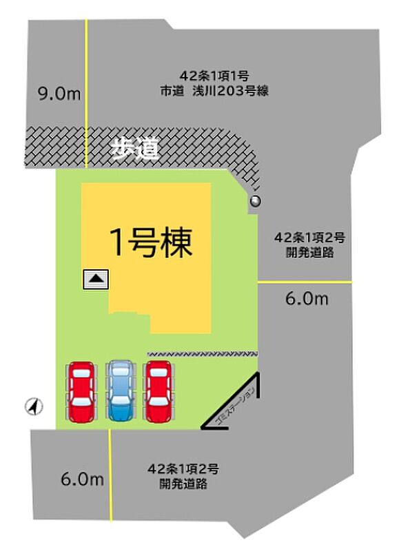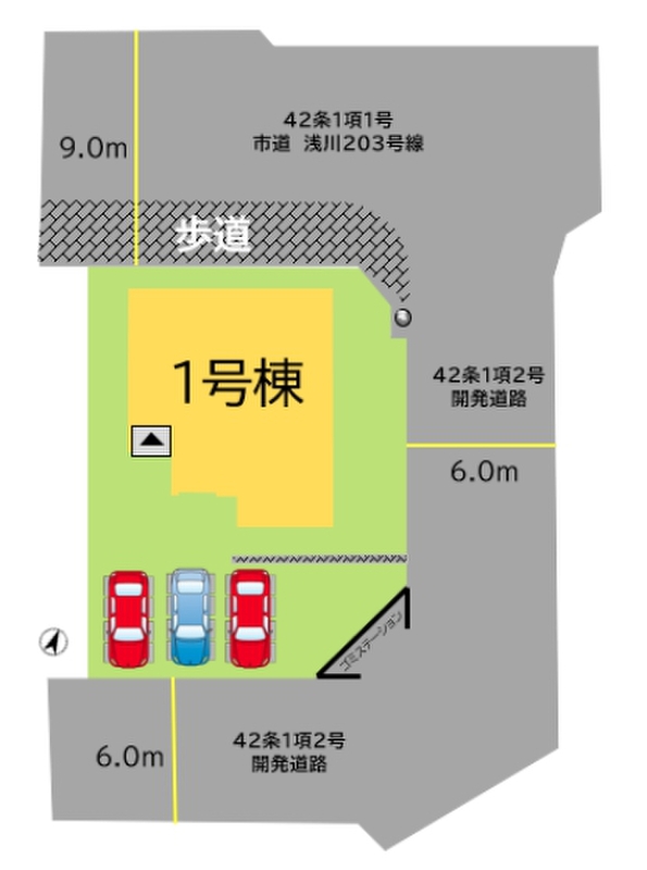 | 駐車場 | 3台 | 道路の幅員 | 三方 ( 南 幅員6m 公道 ) ( 東 幅員6m 公道 ) ( 北 幅員9m 公道 ) |