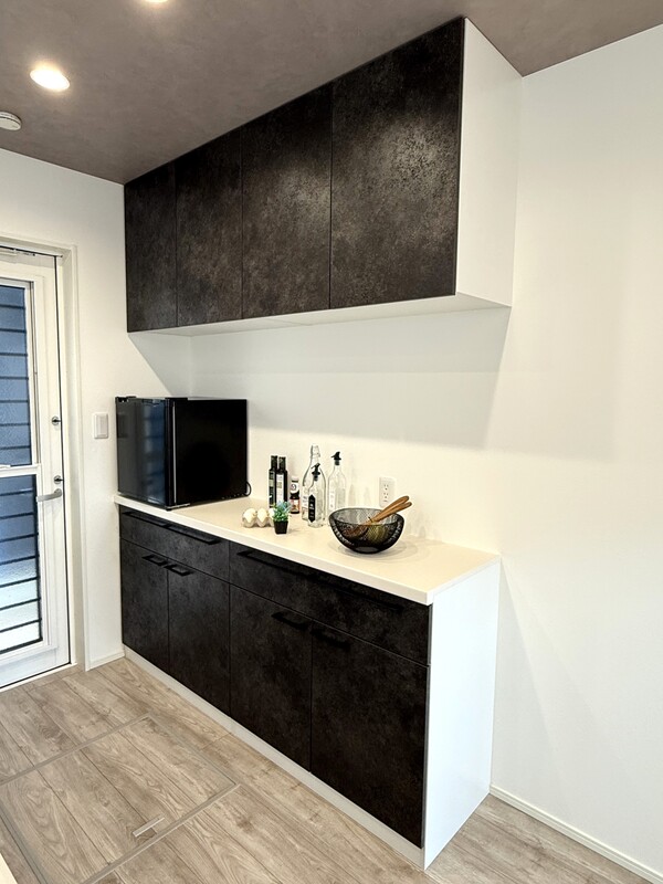 魅力2 ●キッチンと同じテイストのカップボード付き! お洒落で統一感があります♪