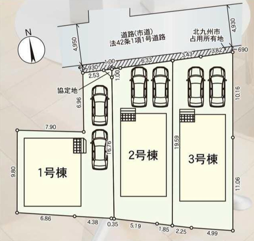 | 駐車場 | 2台 ~ 3台 | 道路の幅員 | 北側4.9m~5m公道 |