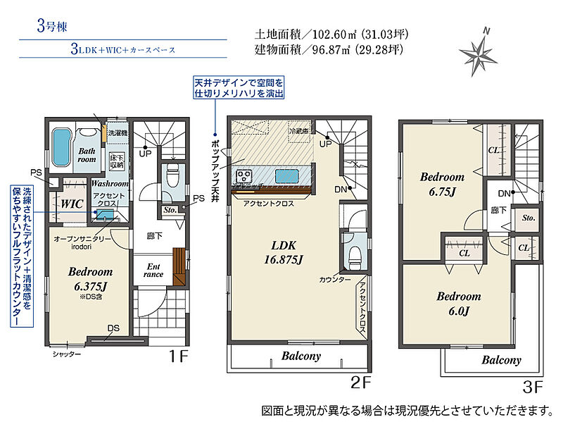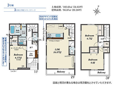 【3号棟】間取図 間取り 3LDK+WIC 価格 4295万円 建物面積 96.87m2 土地面積 102.60m2 -