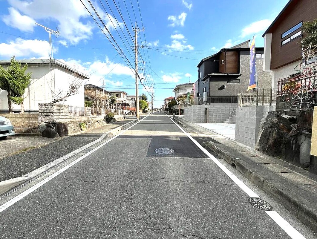 ■駐車並列2台可!道路幅の広い角地で駐車楽々、開放的!