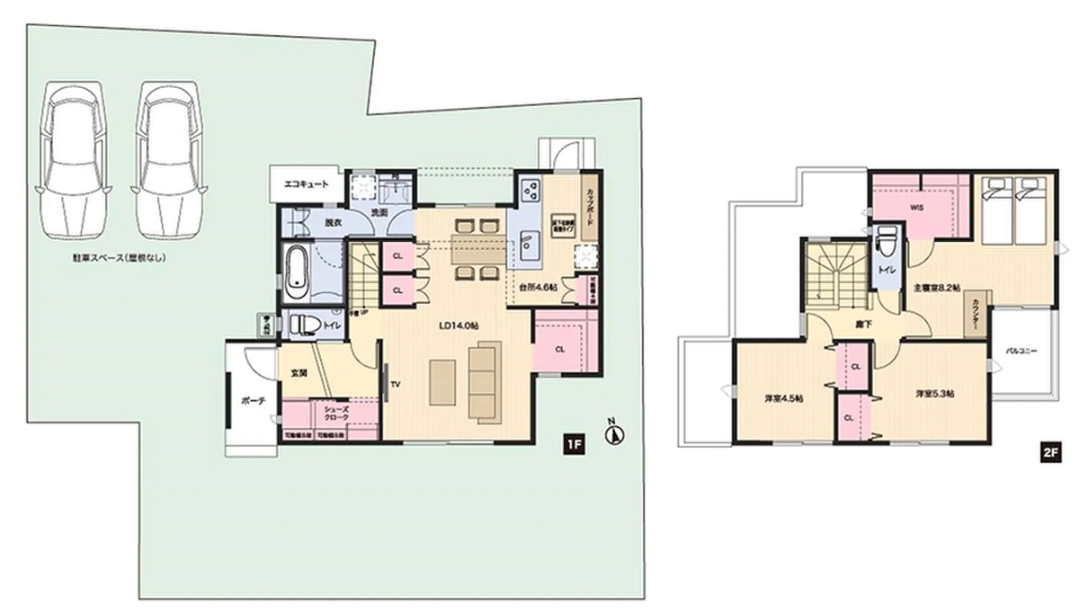 魅力1 ●ゆとりある敷地で広い駐車場とお庭付き!