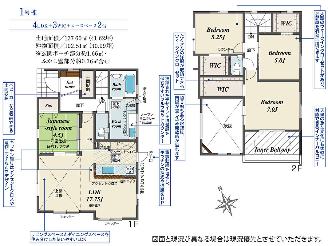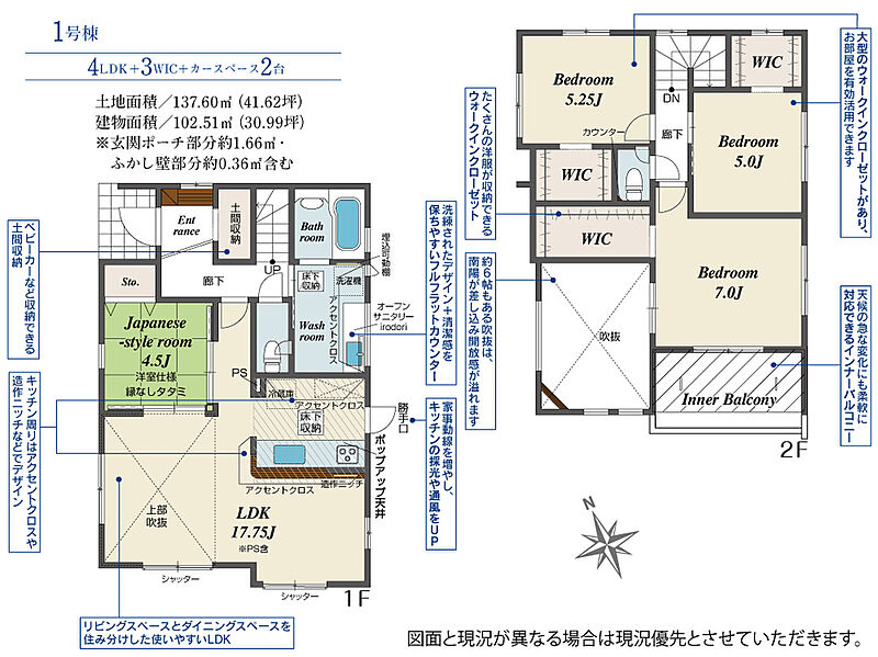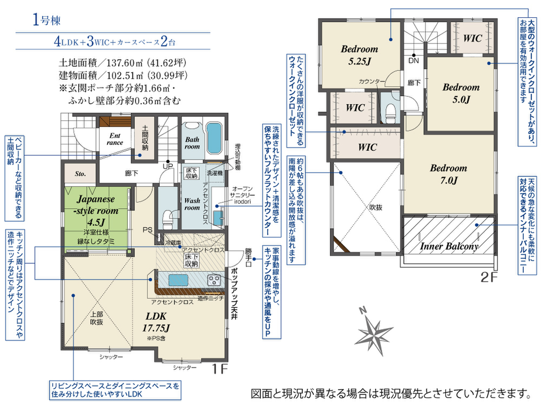【間取図】 間取り 4LDK+3WIC 価格 3199万円 建物面積 102.51m2 土地面積 137.60m2 -