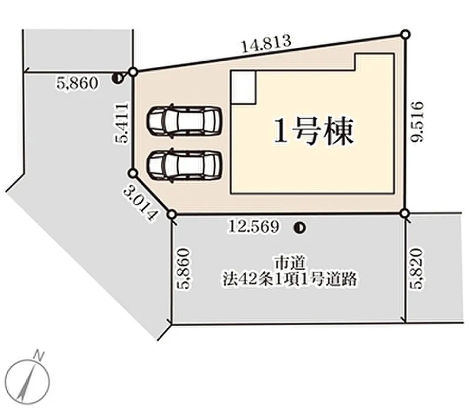 | 駐車場 | 2台 | 道路の幅員 | 南西側5.86m公道、南東側5.86m公道 |