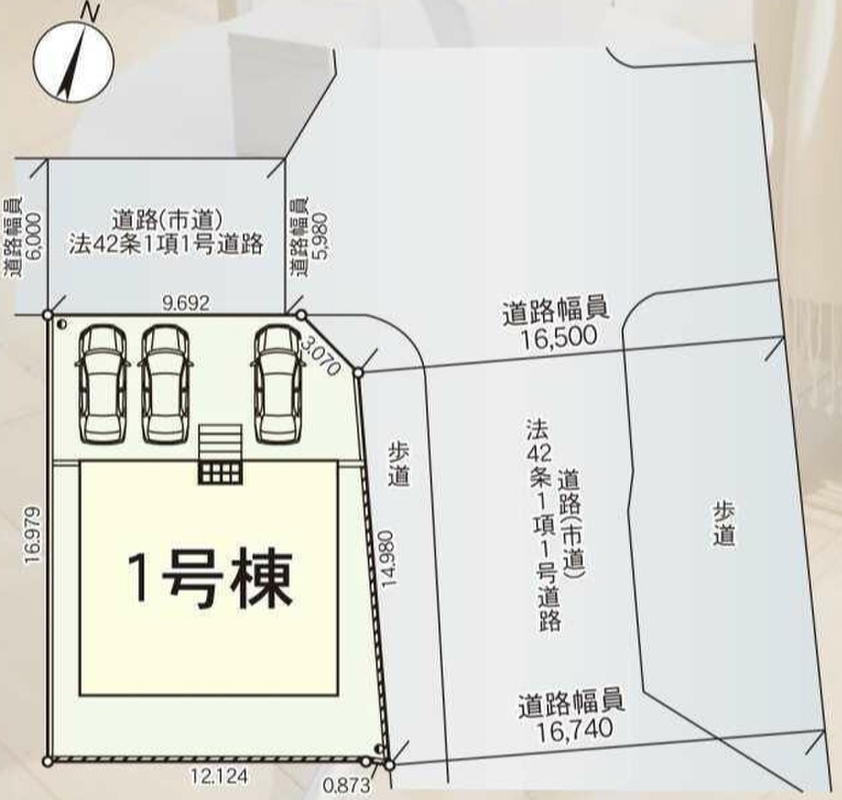 | 駐車場 | 3台 | 道路の幅員 | 角地:(北 幅員5.9m 公道 間口9.6m ) ( 東 幅員16.5m 公道 間口14.9m ) |