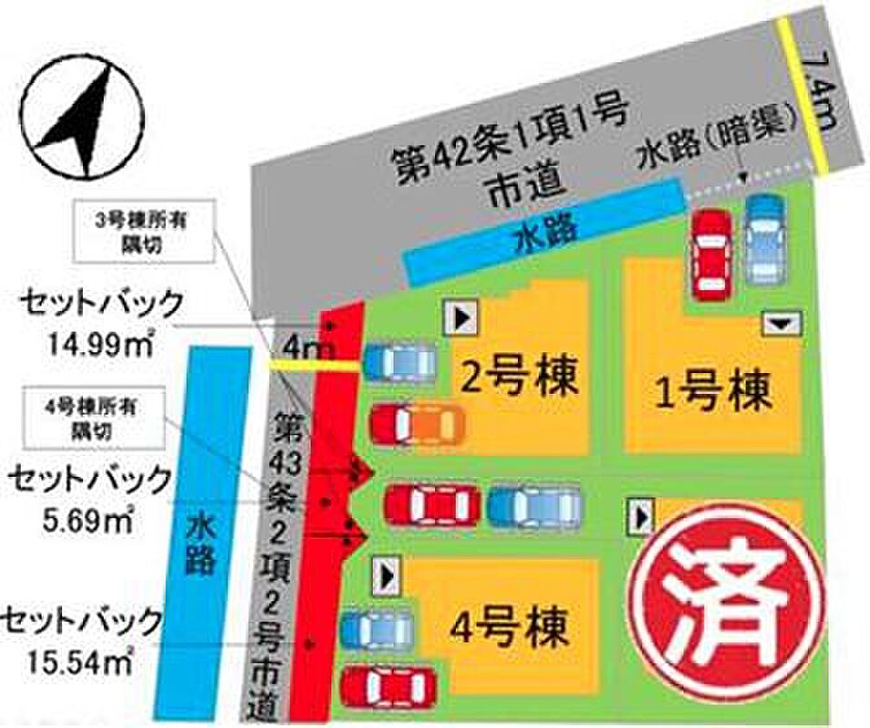 | 駐車場 | 1台 ~ 2台 | 道路の幅員 | 【1・2号棟】北西側7.4m公道 【2・4号棟】南西側4m公道 |
