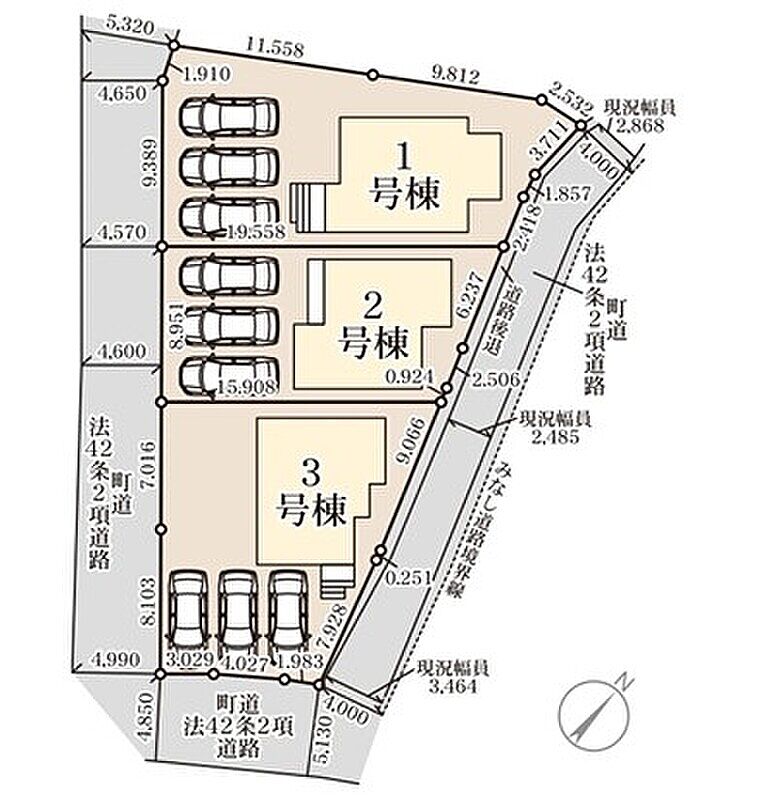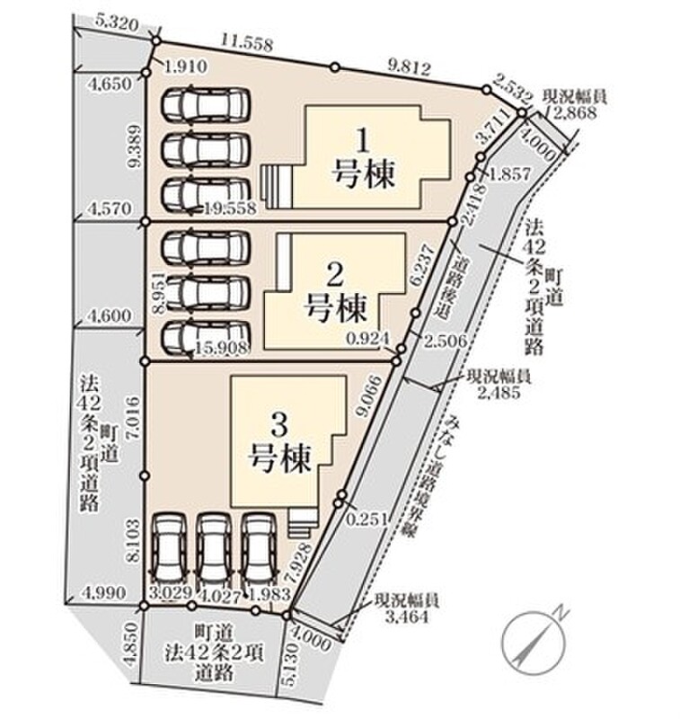 | 駐車場 | 3台 ~ 5台 | 道路の幅員 | 東側2.485m町道、南側4.85m町道、南西側4.57m町道 |