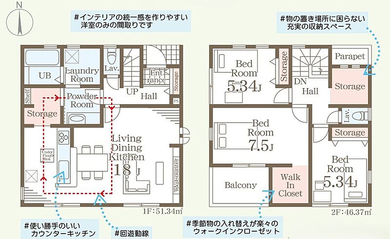 魅力2 ●1階と2階にストレージ、主寝室にウォークインクローゼット付きで収納便利!