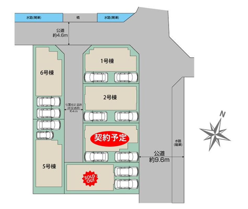 | 駐車場 | 2台 | 道路の幅員 | 北東側9.6m公道、北西側4.6m公道、位置指定道路(新規道路)4.0m |