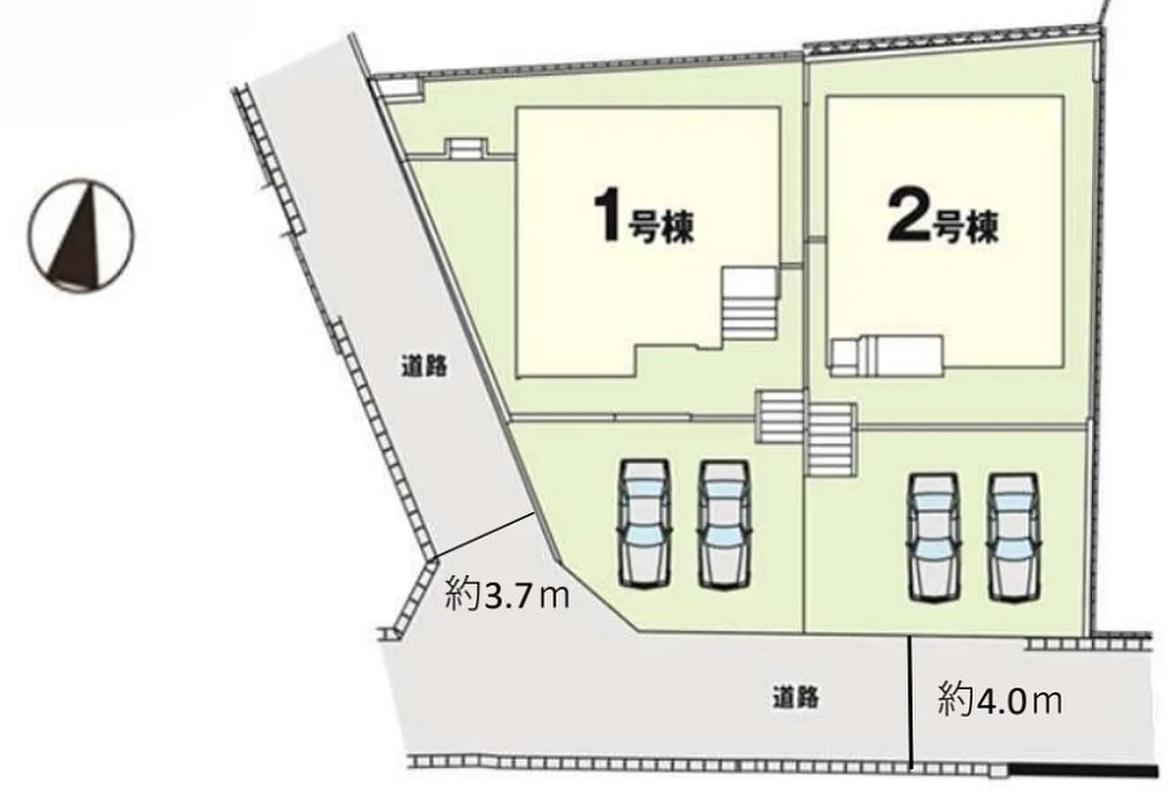 | 駐車場 | 2台 | 道路の幅員 | 南東側4m、南西側3.7m |