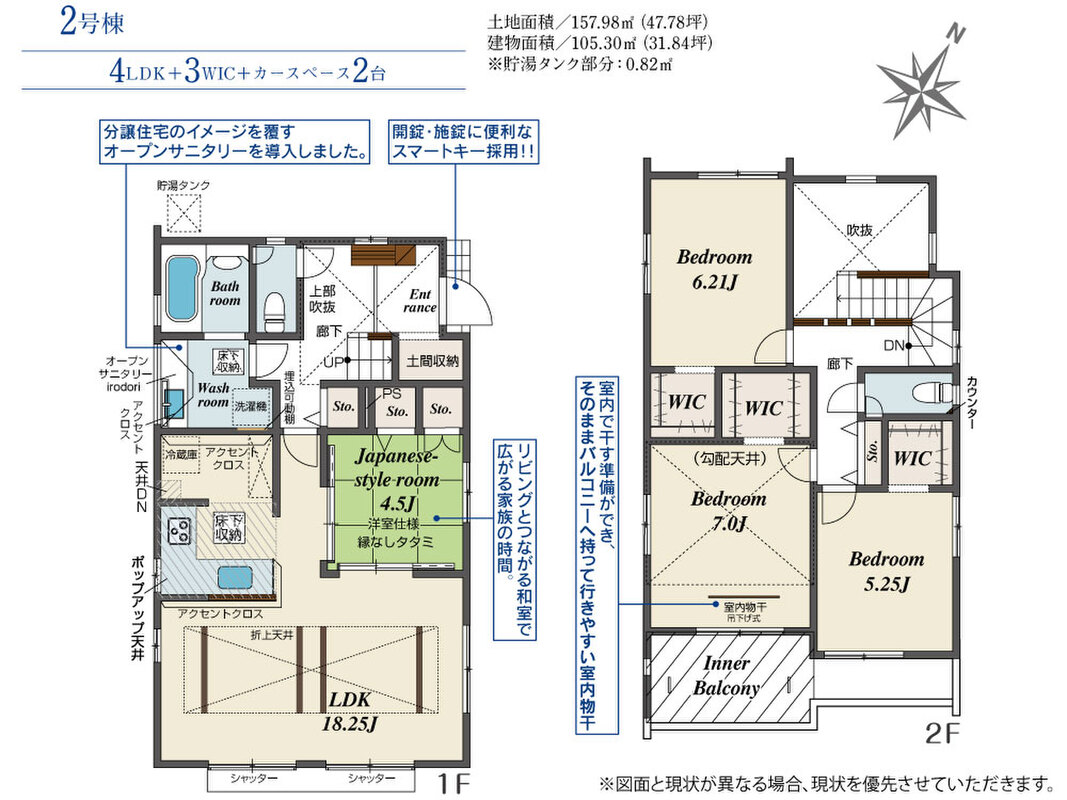 【2号棟】間取図 間取り 4LDK+3WIC 価格 3430万円 建物面積 105.30m2 土地面積 157.98m2 -