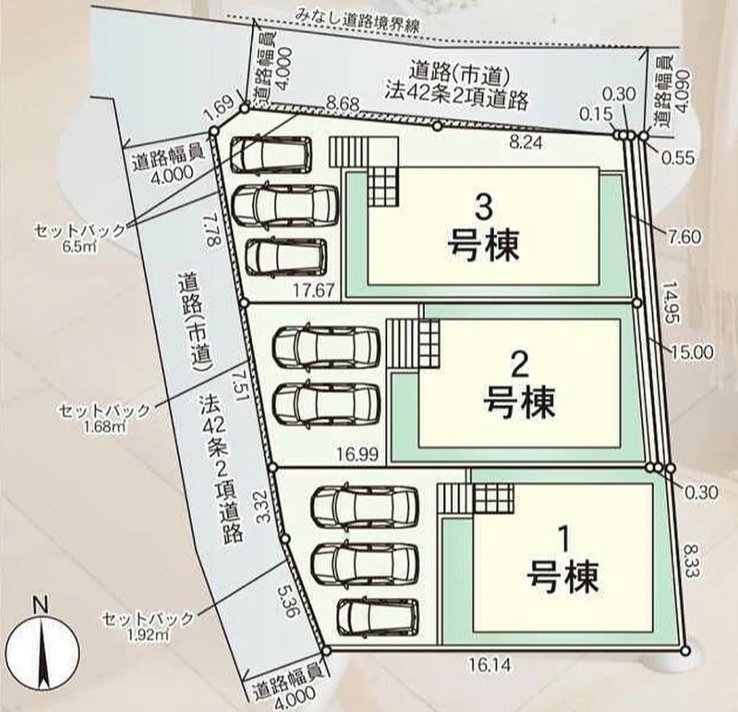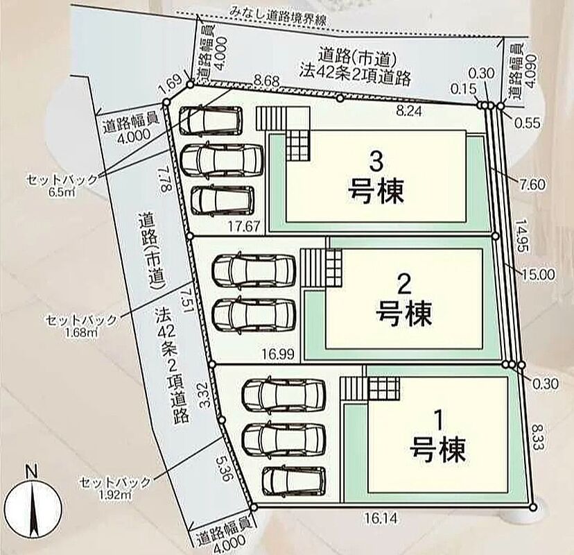 | 駐車場 | 2台 ~ 3台 | 道路の幅員 | 西側4m公道、北側4m公道 |