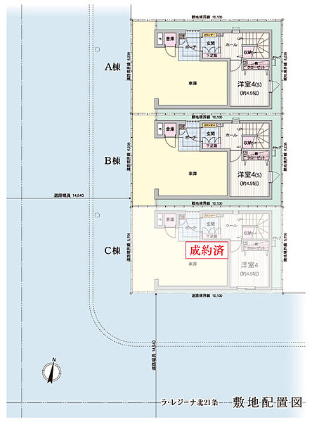 | 駐車場 | 1台 | 道路の幅員 | 私道負担なし、西側14.54m、南側14.54m |