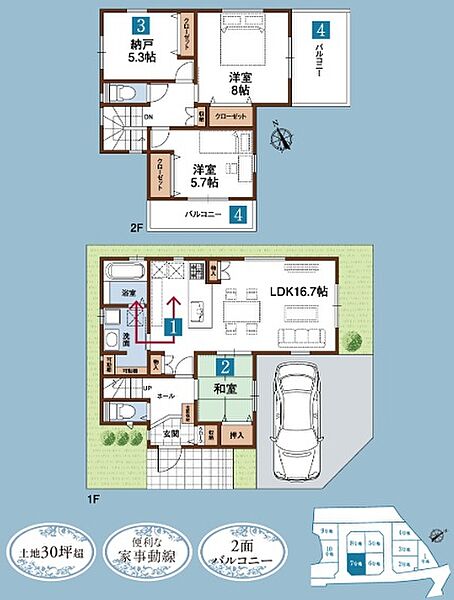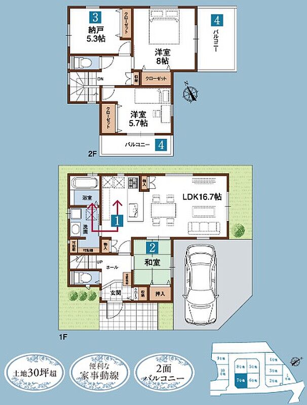 魅力1 東南角地の解放感ある魅力の邸。バルコニー・駐車場が広々使える。