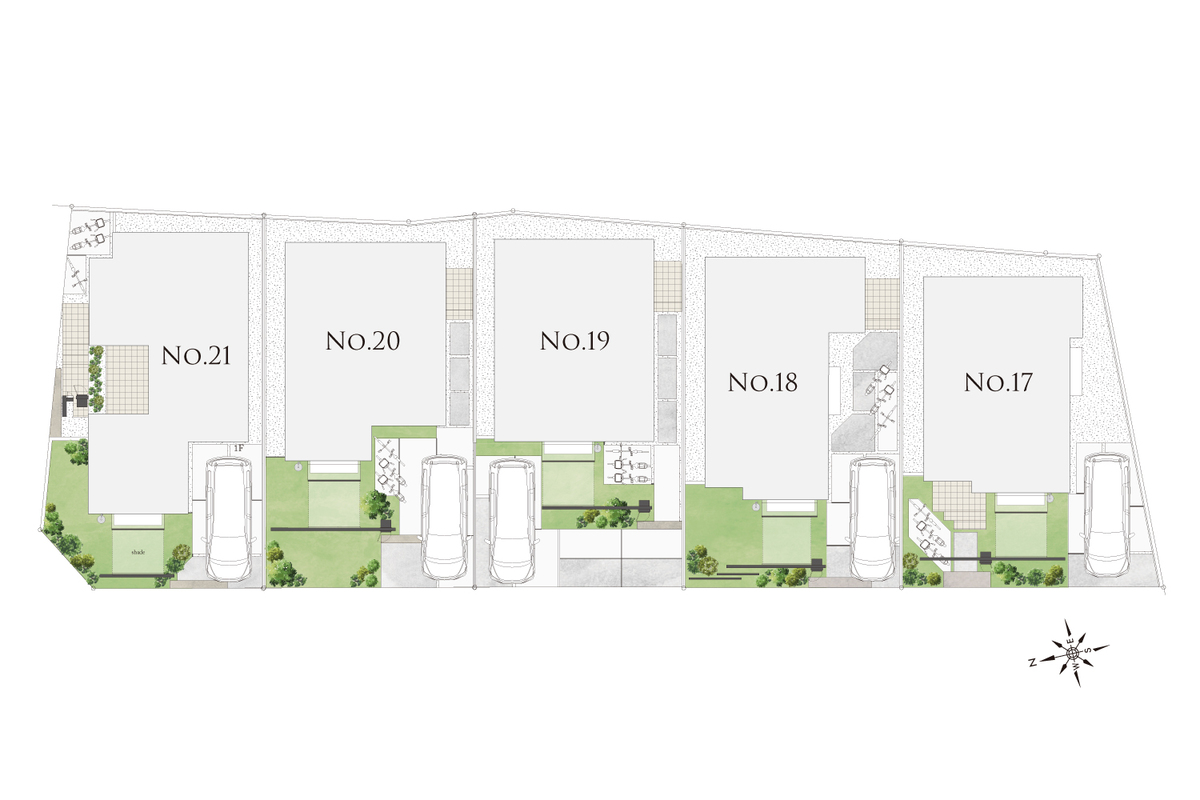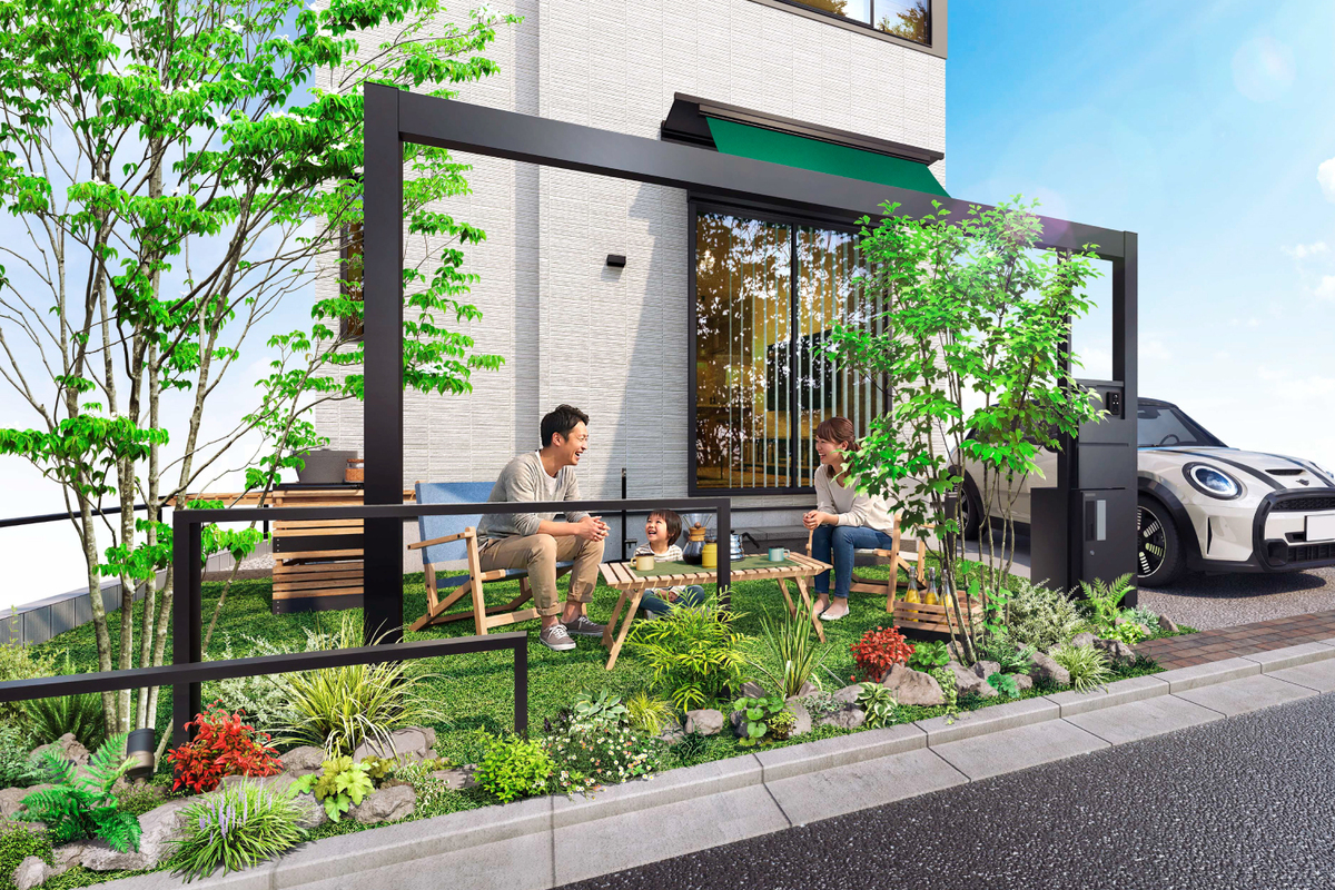 ファサードを彩るフレーム×バイザー×シェードが織りなすリビングの延長空間、内から外へとつながる家族憩いのスペースが全棟に備わります。