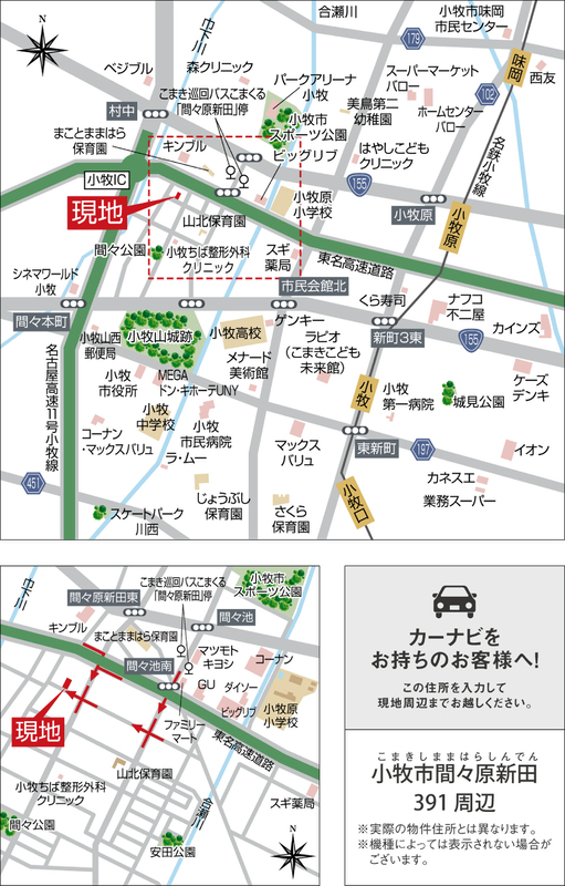 名鉄小牧線「小牧」駅 徒歩約29分 自転車約10分 名鉄小牧線「小牧原」駅 徒歩約31分 自転車約10分 こまき巡回バスこまくる「間々原新田」停 徒歩約8分 |