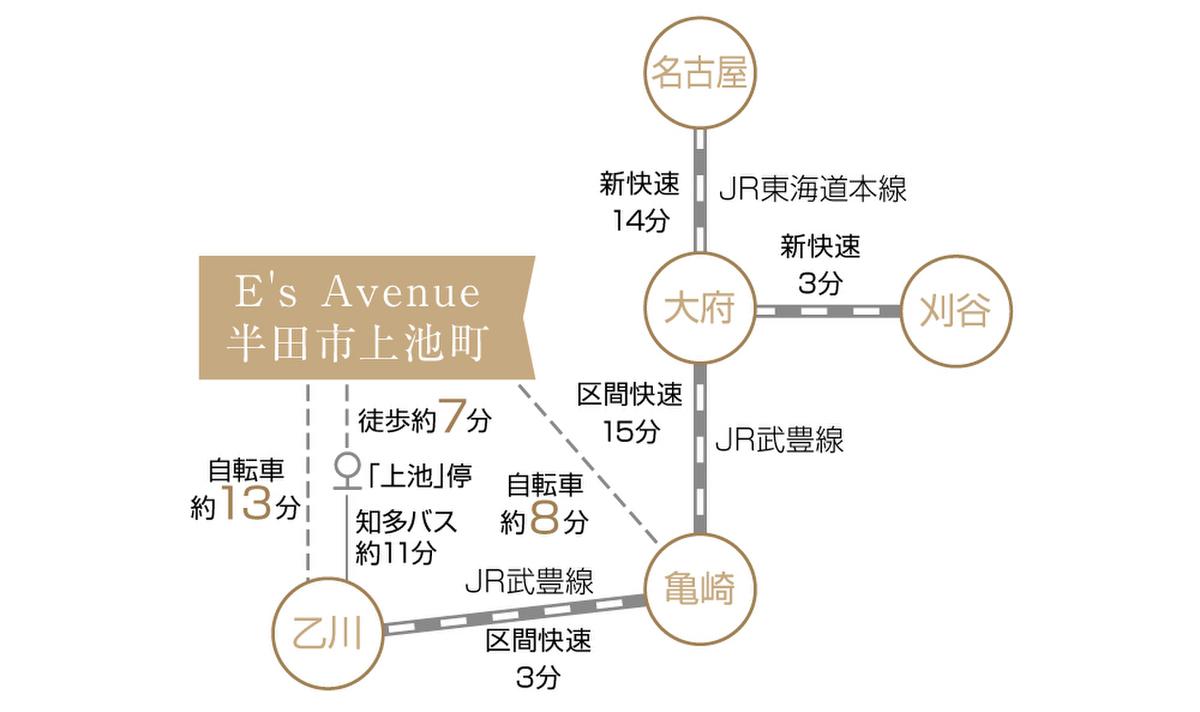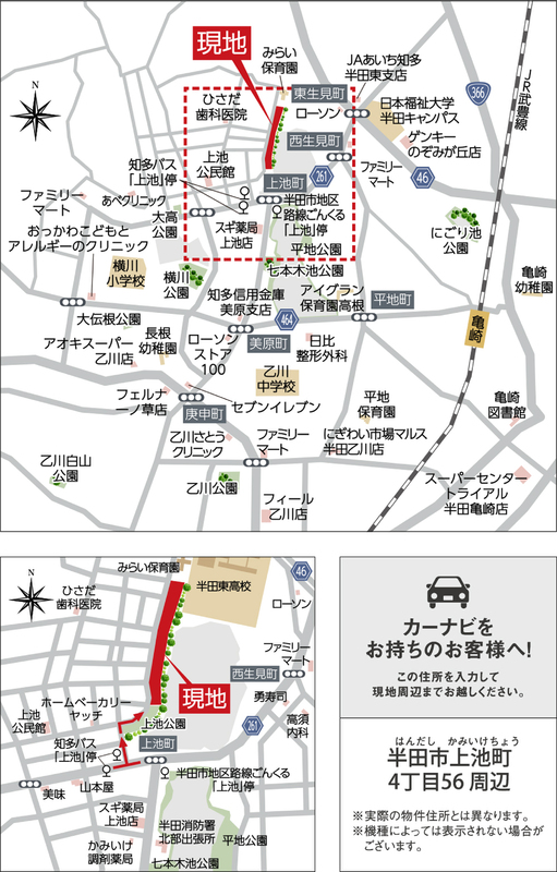JR武豊線「亀崎」駅 徒歩24分 自転車約8分 JR武豊線「乙川」駅 徒歩38分 自転車約13分 知多バス「上池」停 徒歩7分 |