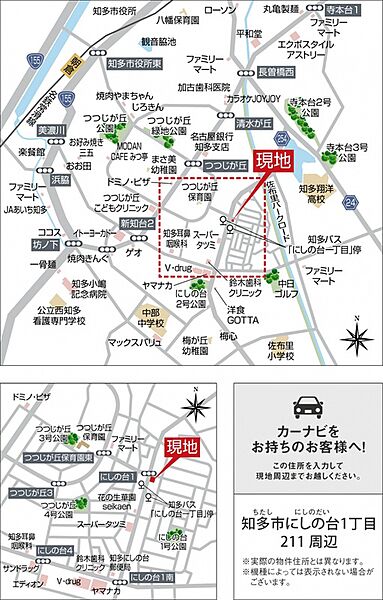 名鉄常滑線「朝倉」駅 徒歩約26分 自転車約9分 知多バス「にしの台1丁目」停 徒歩約1分 |
