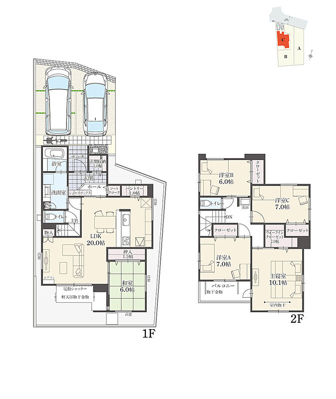 | 駐車場 | 2台 ~ 3台(C棟(2台)、B棟(3台)) | 道路の幅員 | 北側約5.9m公道 |