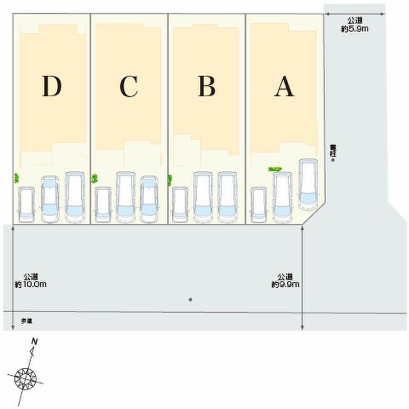 | 駐車場 | 3台 | 道路の幅員 | 公道:南側約9.9~10.0m・東側約5.9m |