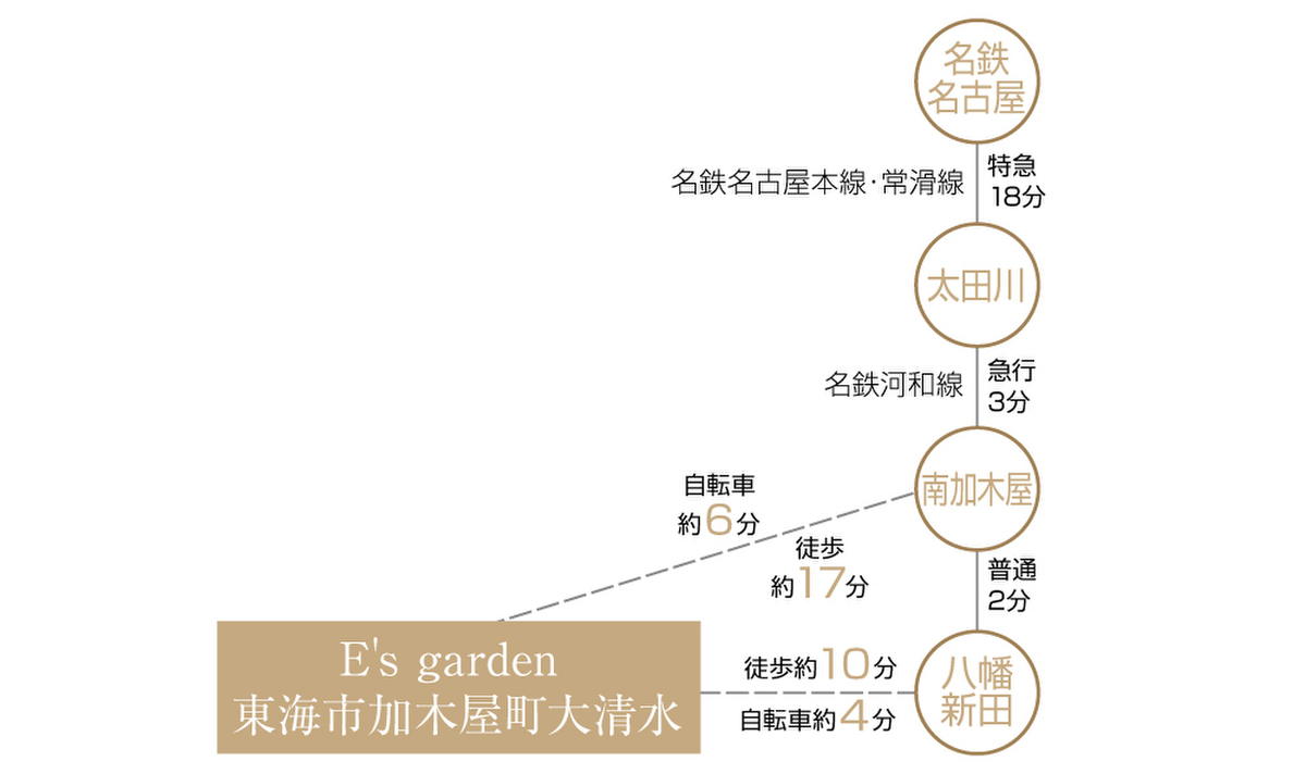 名鉄河和線「八幡新田」駅 徒歩10分 自転車約4分 名鉄河和線「南加木屋」駅 徒歩17分 自転車約6分 |