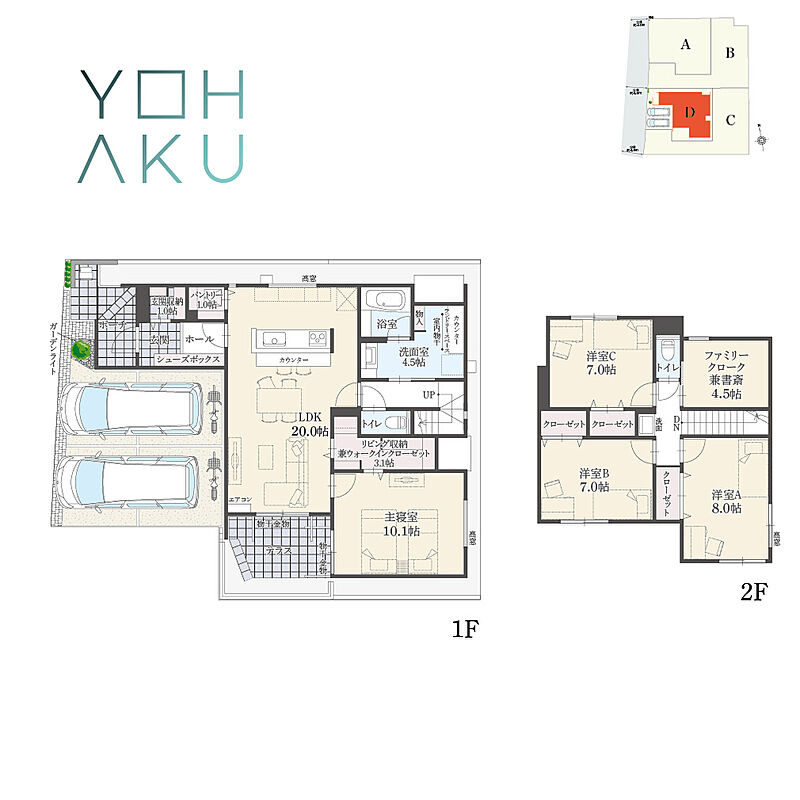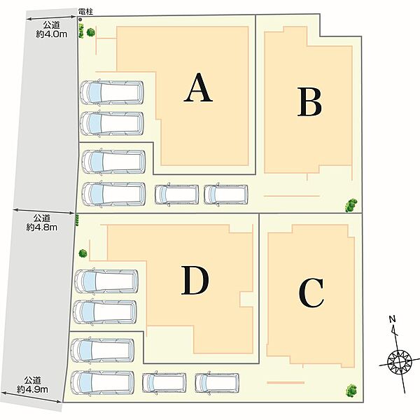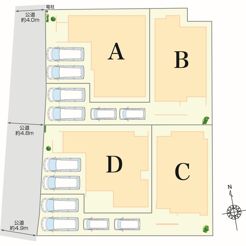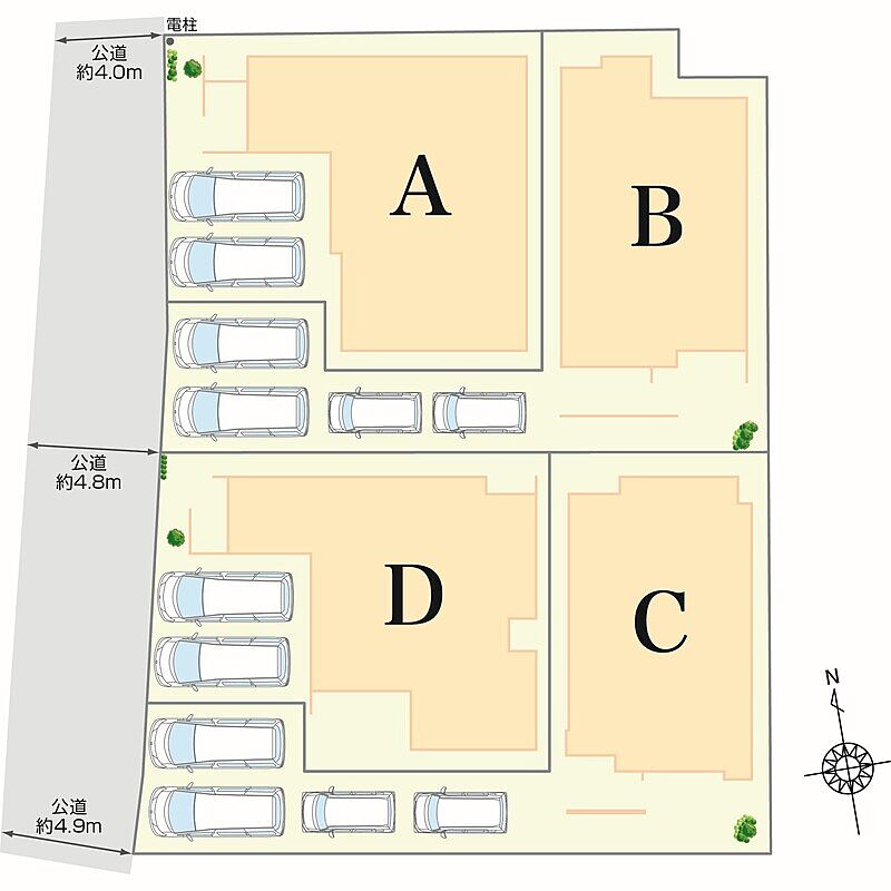 | 駐車場 | 2台 ~ 4台(A・D棟(2台)、B・C棟(4台)) | 道路の幅員 | 西側約4.0m~約4.9m公道 |