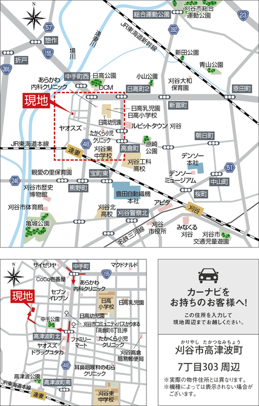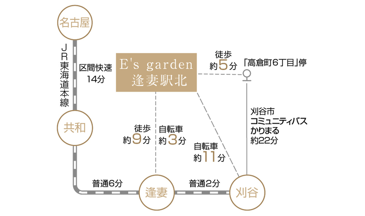 JR東海道本線「逢妻」駅 徒歩9分 自転車約3分 JR東海道本線「刈谷」駅 徒歩33分 自転車約11分 刈谷市コミュニティバスかりまる「高倉町6丁目」停 徒歩5分 |