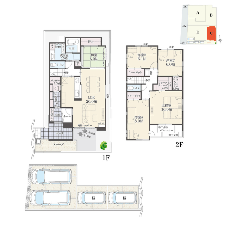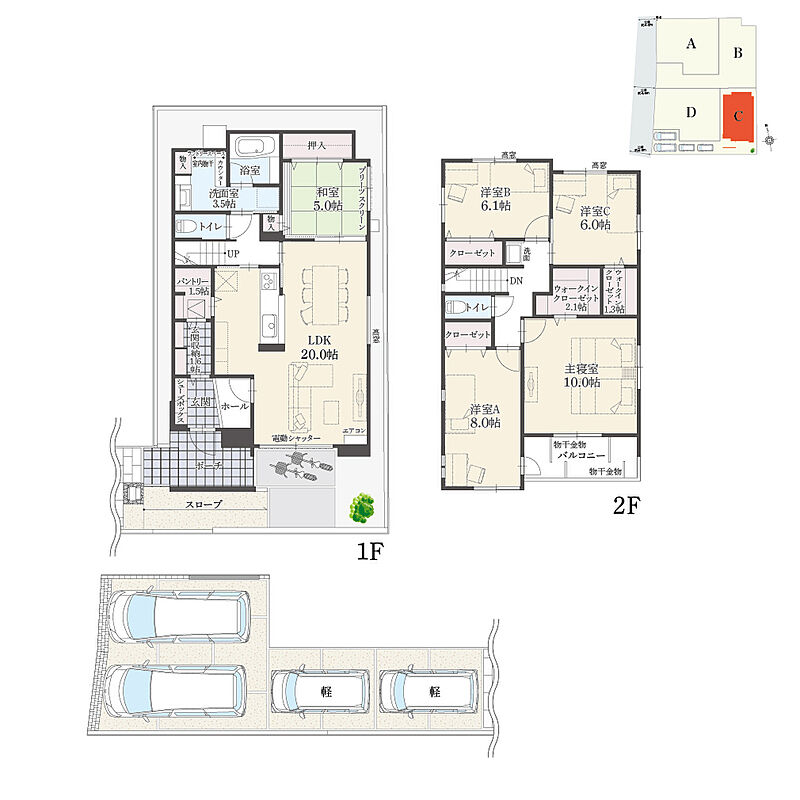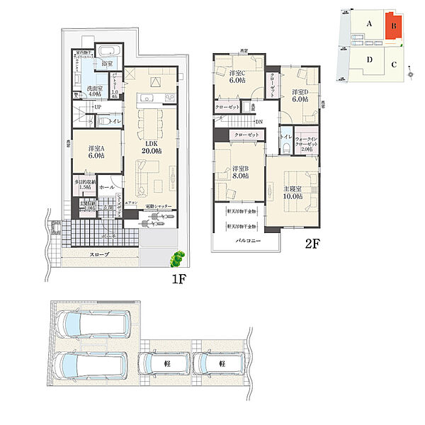 ・敷地延長部分:B棟56.06m2、C棟59.61m2(各々土地面積に含む) ・その他制限事項:宅地造成工事規制区域 ・諸経費が別途必要となります。詳細については係員までお問合せ下さい。 ・掲載の間取り図・区画図は計画段階のものを基に描き起こしたもので、実際とは異なる場合がございます。 ・所要時間は地図上の概測距離を80m=徒歩1分、250m=自転車1分、車は時速40kmで計算したものです。 ・駐車台数は、区画図または各間取り図に表示の自動車サイズを想定しております。車種によっては駐車台数が異なる場合があります。 ・内観写真内の家具はモデル用又はCG加工によるものであり、実際の物件には付属していません。 |