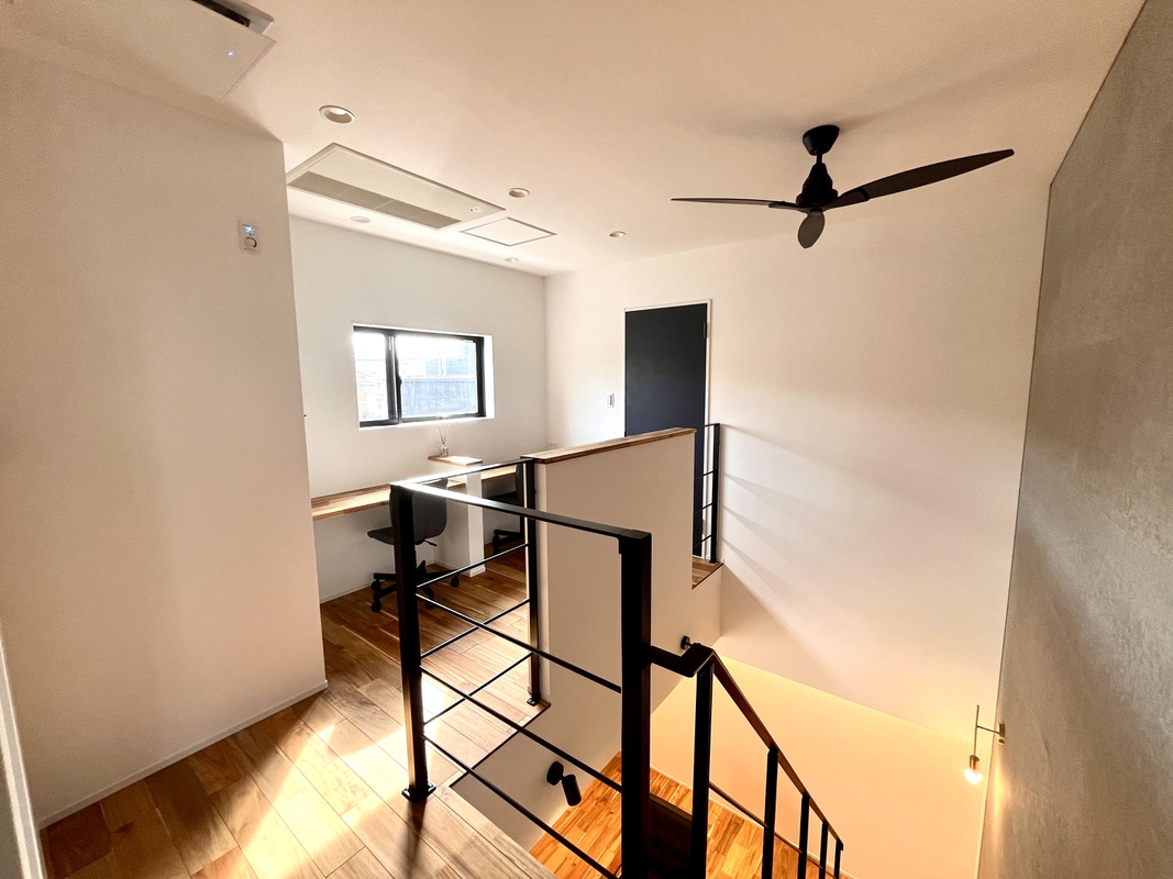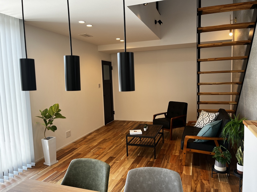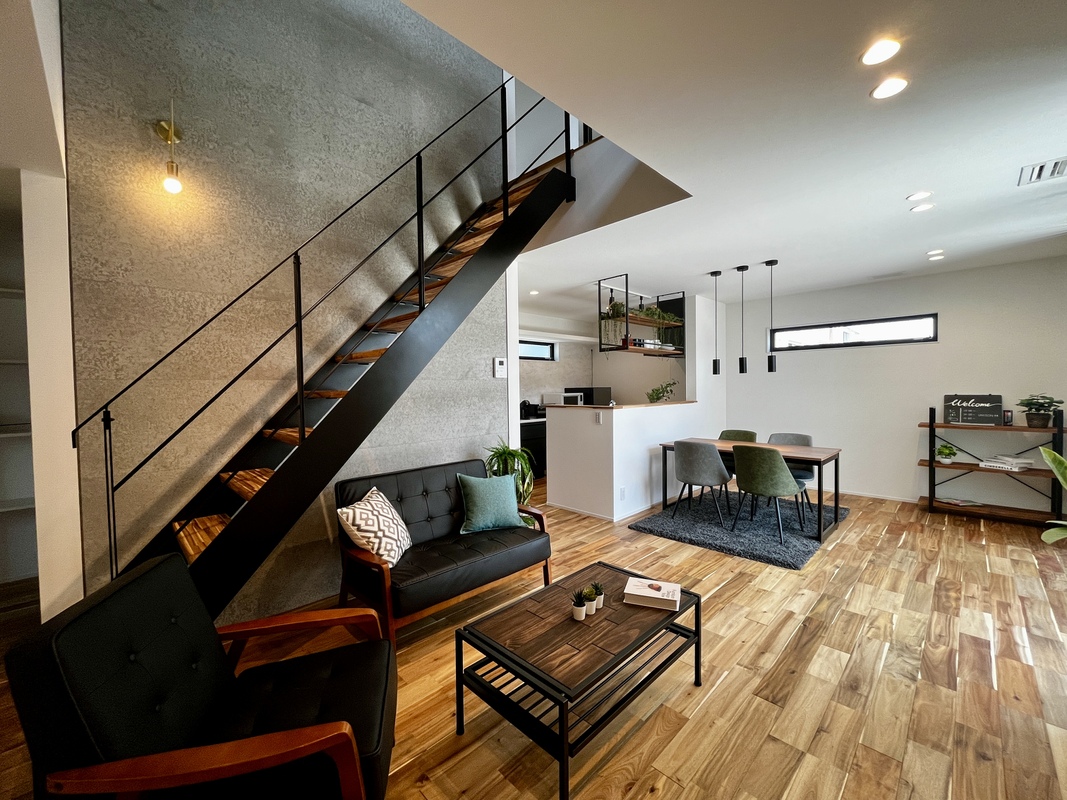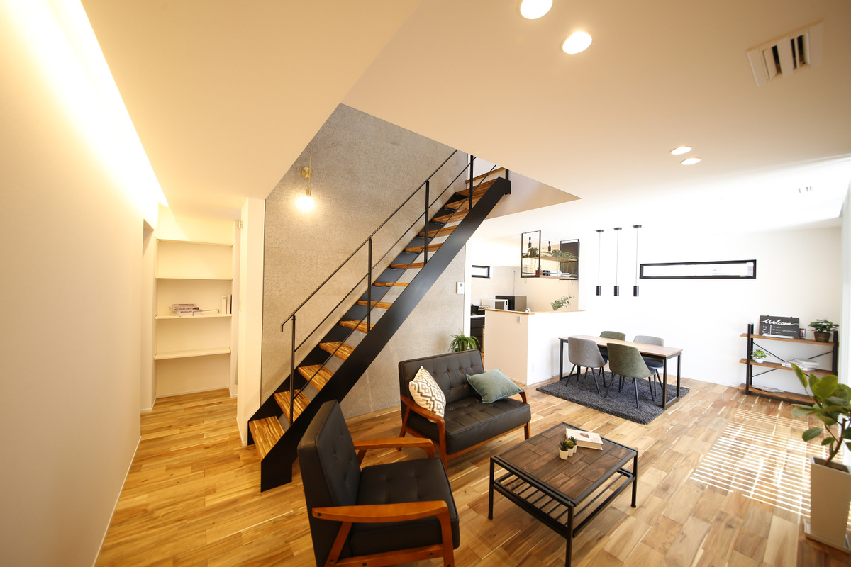 インパクトのあるアイアンの鉄骨階段を中心としたLDKで家族のつながりを実感。床材は温かみのあるアカシアの無垢床を使用。