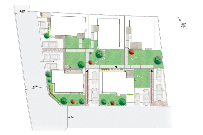 全5邸が50~62坪の敷地で、美しい緑が映える広さ。芝生スペースや2台のカースペースに加え、バードバスなど自然と共に暮らせる工夫を取り入れています。