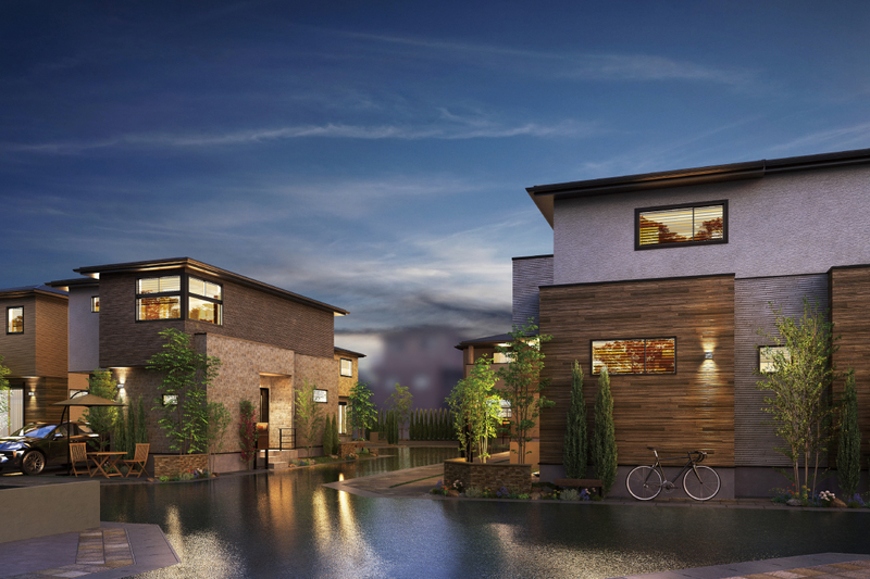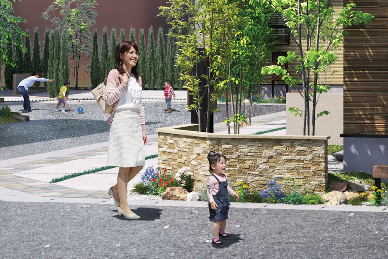 モダンなシルエットに木目調と石積調の外壁を組み合わせ、街に一体感をもたらしています。各邸には季節感あふれる植栽を配し、街をゆっくりと散歩すれば外観と植栽が調和して生まれる、美しい風景を楽しめます。さらに夜になると街に照明が灯り、帰宅する人をやさしく迎えます。
