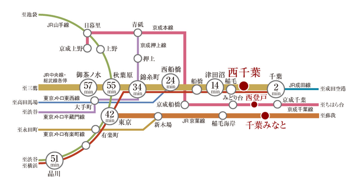 文教都市の落ち着きとベイエリアの景観を兼ね備えた西千葉エリア。JR総武線「西千葉」駅を含む3駅4路線が利用でき、主要駅へスムーズなアクセスが叶います。