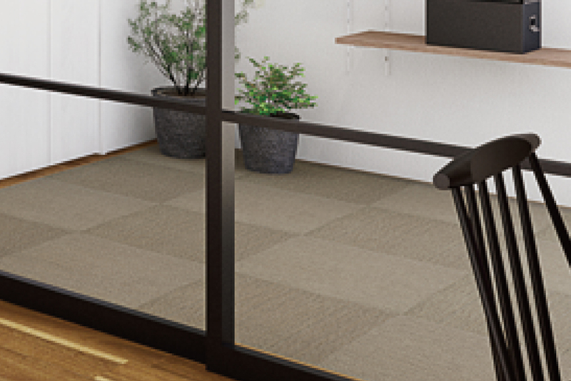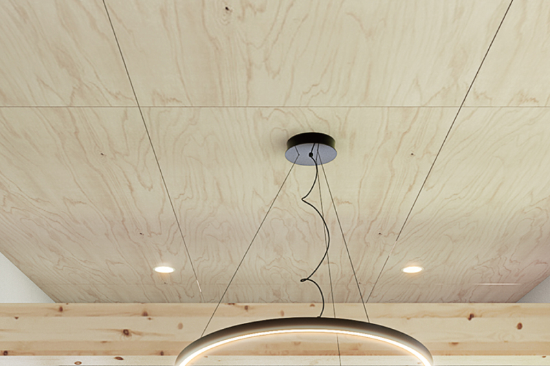 国産資源を有効活用した檜合板の建材を、リビングの天井材としました。ゆとりある空間や化粧梁の木目と美しく調和し、リラックス効果がある檜特有の香りも楽しめる素材です。