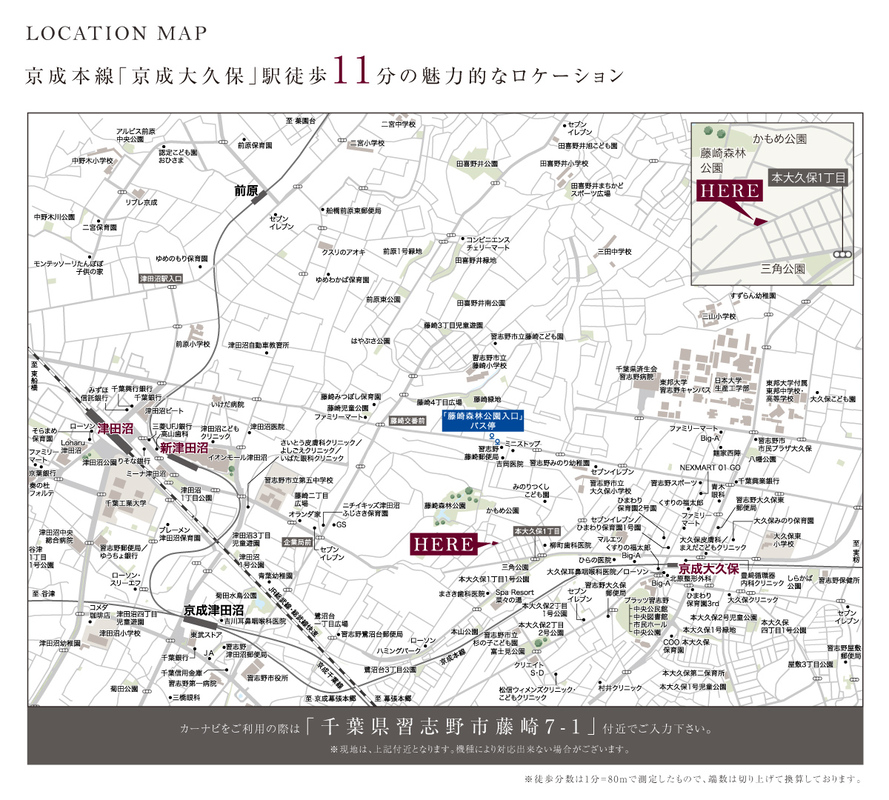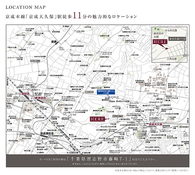 京成本線「京成大久保」駅 徒歩11分 JR総武本線「津田沼」駅 バス15分 藤崎森林公園入口バス停 徒歩8分 JR総武本線「津田沼」駅 徒歩25分 |