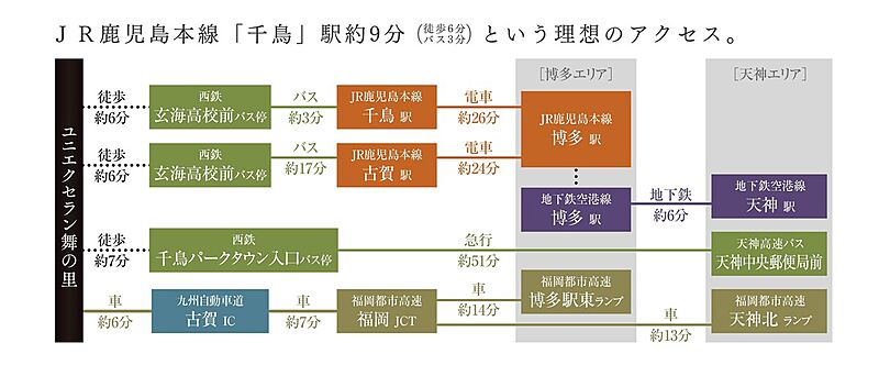 JR鹿児島本線「千鳥」駅 徒歩17分~17分 西鉄「千鳥パークタウン入口」高速バス バス停 徒歩7分~7分 西鉄「玄海高校前」バス停 徒歩6分~6分 |