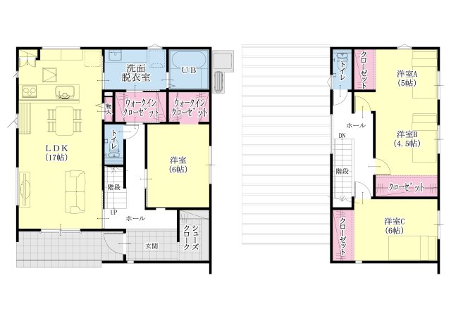 【1階完結型の間取りで将来も安心】 1階洋室+WIC2か所で、将来的に平屋のような暮らしも可能。 広々とした17帖LDK、3帖の洗面脱衣室、可変性ある2階洋室など、家族に寄り添う設計です。