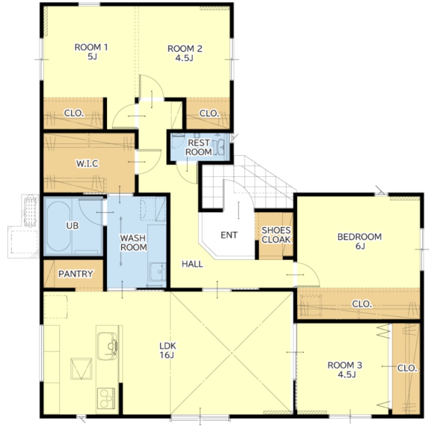 全室フローリング設計。 1階に16帖のLDKと洋室が4部屋。居室とは別に3帖のウォークインクローゼットを配置。 玄関にはシューズクロークを配置。全居室収納付き♪ 駐車は並列2台駐車可能です♪