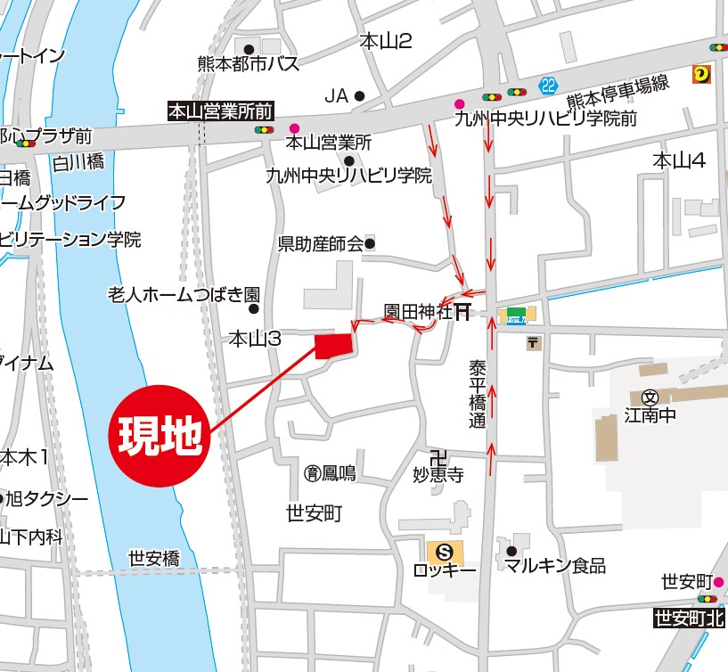 熊本市電A系統「祇園橋」駅 徒歩11分 JR鹿児島本線「熊本」駅 徒歩13分 |
