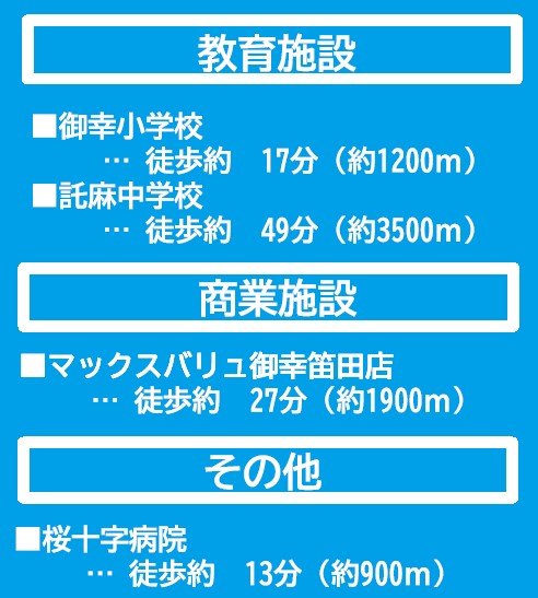 - ※物件から周辺のお店・施設までの距離は、利用が想定される道路を通行した場合の距離です。なお、必ずしも最短距離を保証するものではありません。