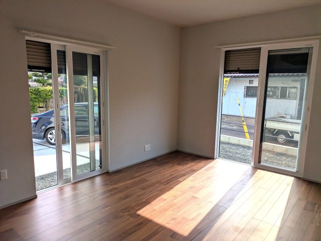 オール電化・上下水道完備の新築住宅。2×4工法による安心構造と天井高2.7mの開放感、ペアガラスや1階シャッターで快適性にも配慮しています。