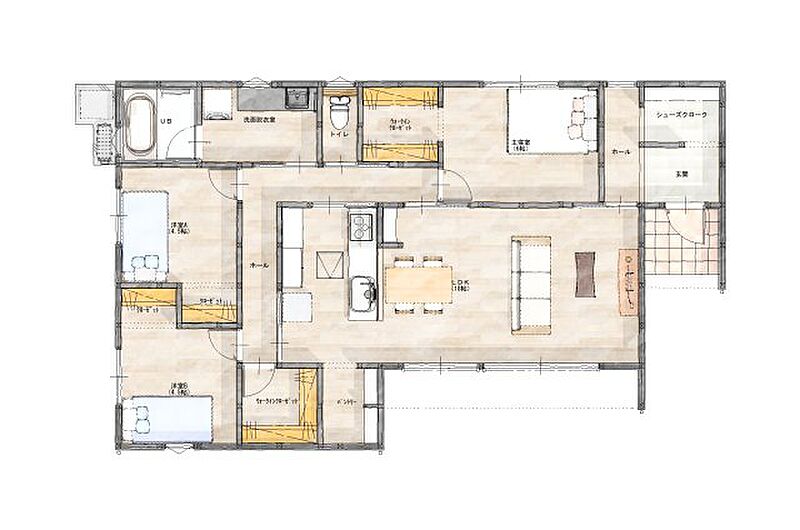 【家事がラクになる平屋設計】 18帖の広々LDKに、深型食洗機・パントリー・カップボード付きキッチン。 1.5坪の洗面脱衣室で「洗う・干す・アイロン・畳む」が1カ所で完結し、家事時間を短縮できます。