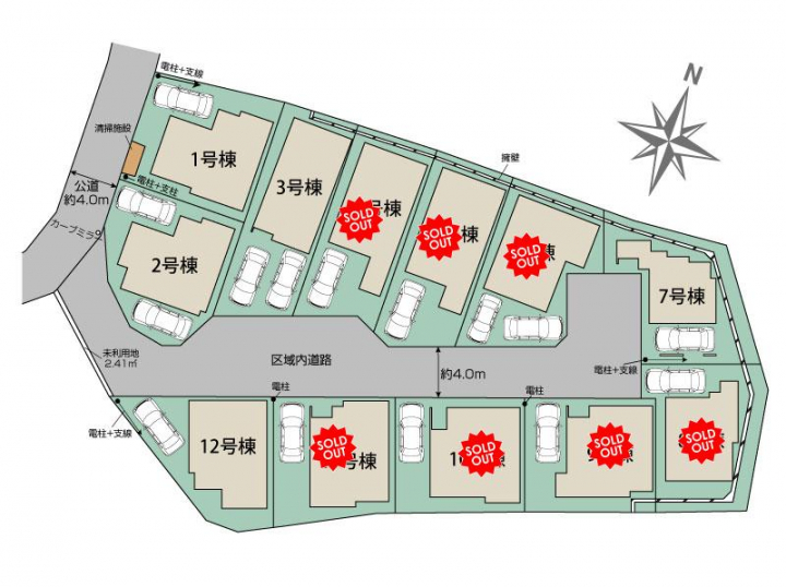 | 駐車場 | 2台 | 道路の幅員 | 西側約4.0m公道、分譲地内開発道路約4.0m |