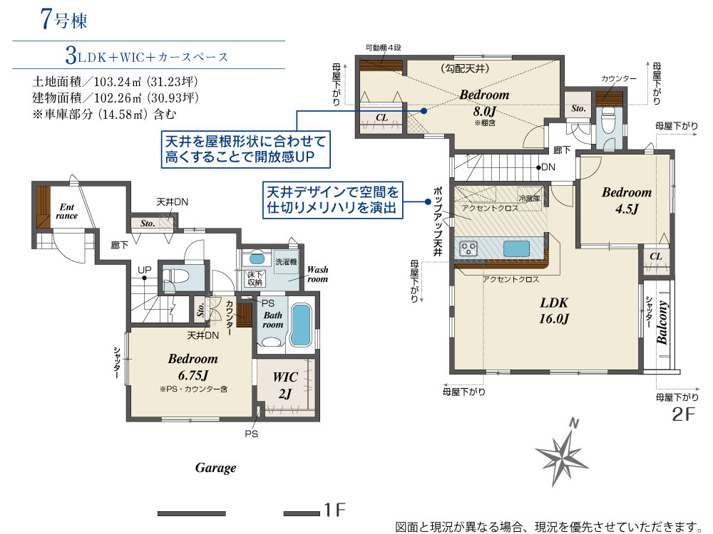 | 建物面積 | 97.19m2(約29.39坪)~102.26m2(約30.93坪) | 土地面積 | 100.10m2(約30.28坪)~108.56m2(約32.83坪) |