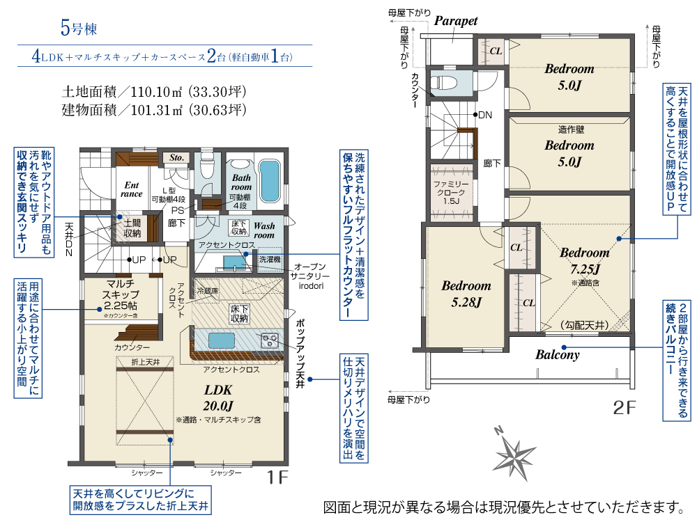 | 建物面積 | 99.22m2(約30.01坪)~101.31m2(約30.64坪) | 土地面積 | 110.09m2(約33.30坪)~110.53m2(約33.43坪) |