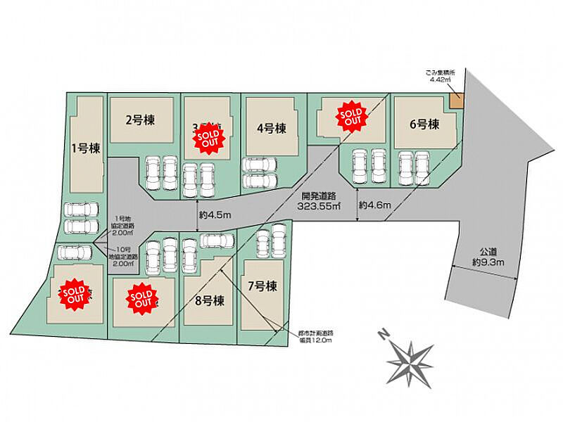 【接道】南東9.3m公道 【設備】公営水道、東京電力、個別プロパンガス、本下水 【都市計画道路】平塚山下線(5~9号棟) 【協定道路】敷地面積に含む 1号地:2.00m2、10号地:2.00m2 【セットバック】不要 【その他法令】第2種高度地区、準防火地域 【その他持分】【ゴミ集積所】4.42m<sup>2</sup>×各1/10 |