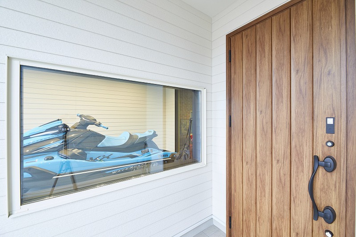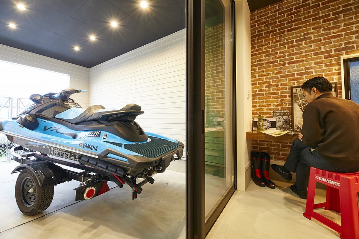 壁は外壁と同じ素材なので水に強く、ちょっとしたクルマいじりや、メンテナンススペースに活躍するインナーガレージです。車だけでなく、バイクや自転車など様々なガレージとしても重宝します。