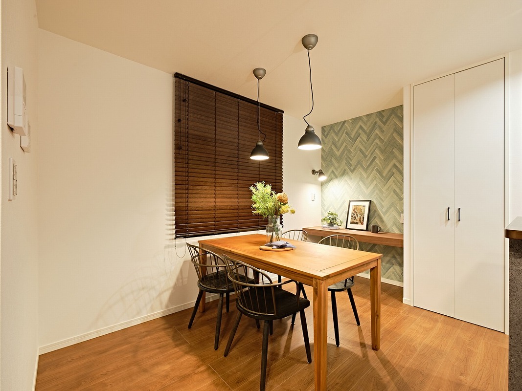 ダイニングに併設のスタディコーナーは子供たちの宿題スペース。食事の用意をしながら見守り学習ができる安心身守り設計です。