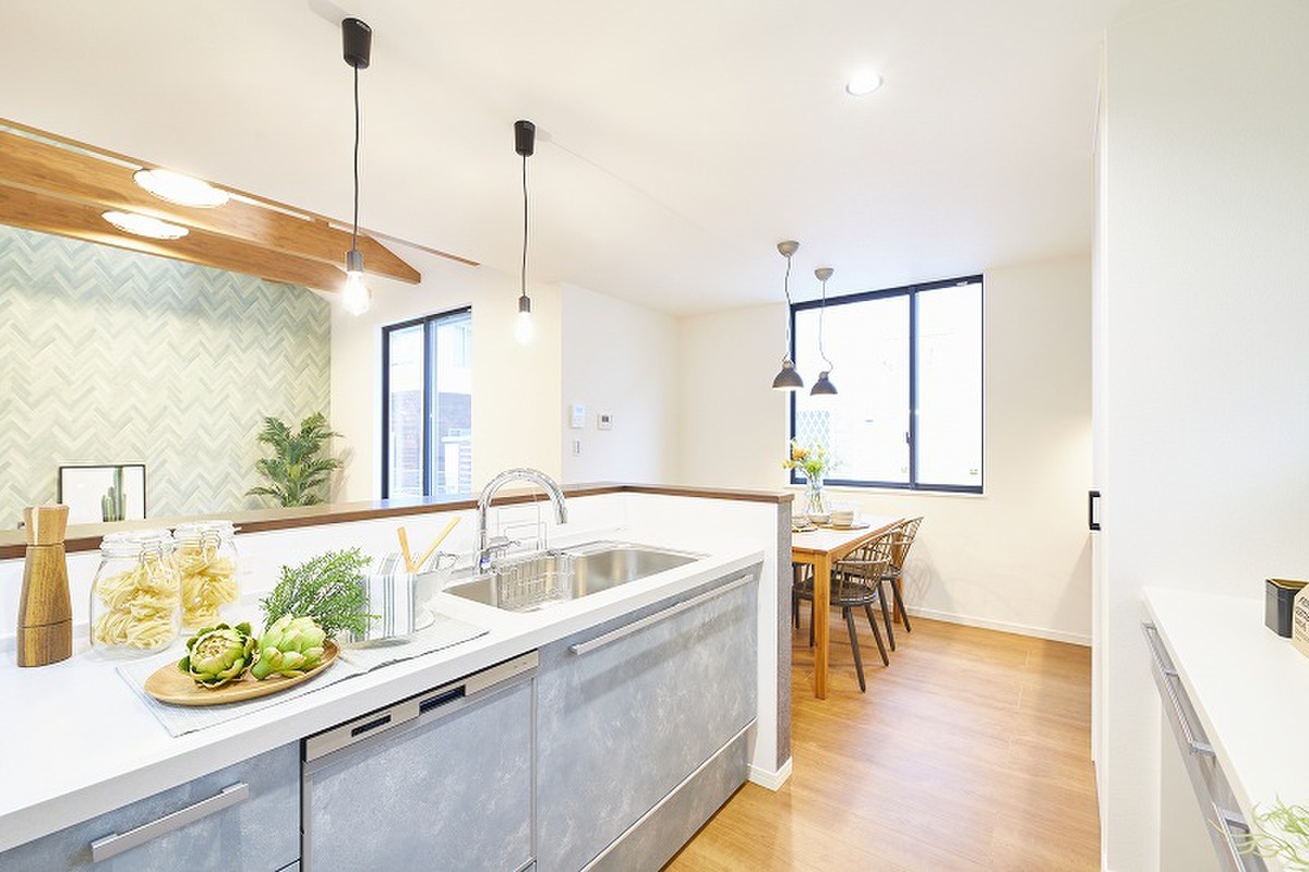 配膳に便利なダイニングキッチン。お手伝いしてもらいやすい効率の良いスライド配膳が可能です。