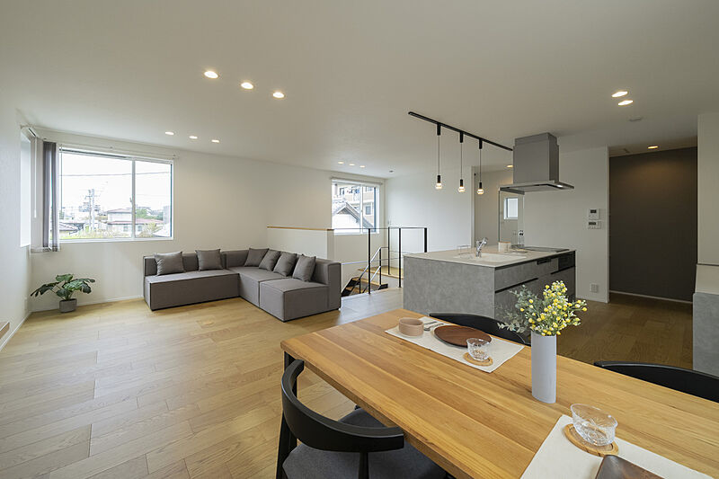 【内と外をつなぐ視線の抜け感 開放感あふれる2階リビング】1階に居室と水まわりをまとめ、25帖の大空間2階リビングを実現。